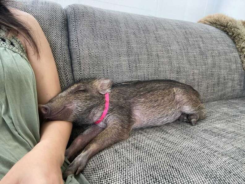 “I asked around about how to take care of wild boars, and everyone said it’s not easy if they are this young and that they always die without the mother, but we were determined to keep her,” Wei said. “We read online that she would need to be fed every hour, so my boyfriend and I took turns sleeping in the living room with her for almost the first four weeks, feeding her every hour when she woke up and started crying.”