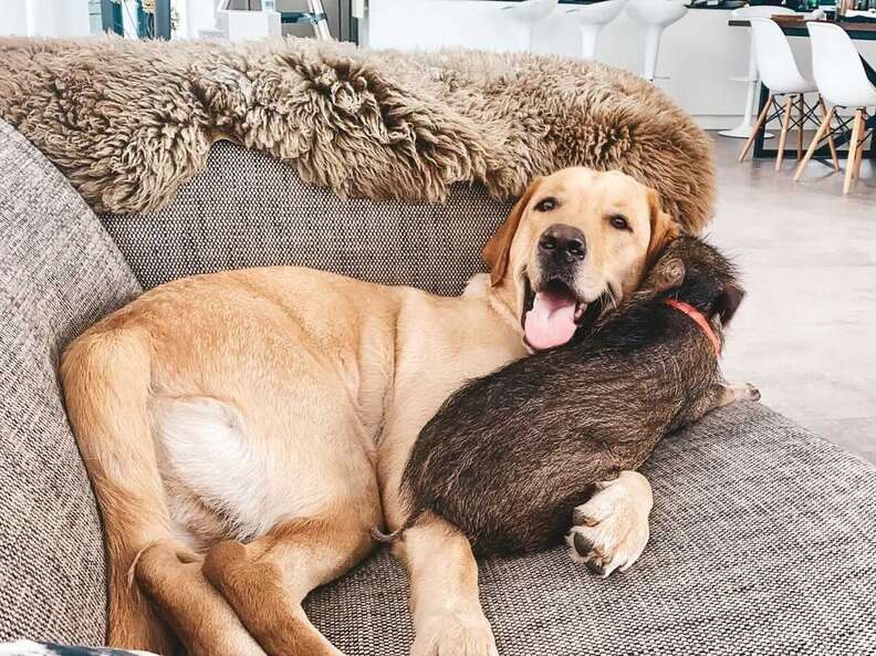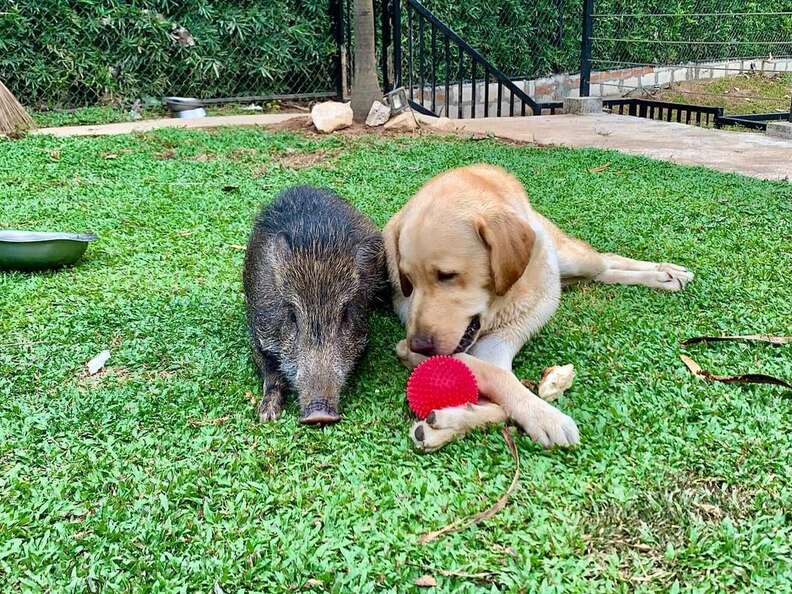 Check out the video below to watch the adorable 2-pound baby wild boar, Yezhu deciding that the very patient Labrador is her dad — and he uses her for a pillow whenever they take naps together ❤️