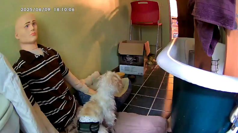 That night, McNeil decided to test it out for real. Before heading to work, she sat Fred in Gus’ favorite spot — the bathroom. Hours later, she checked her dog cam, expecting to see Gus pacing or barking.