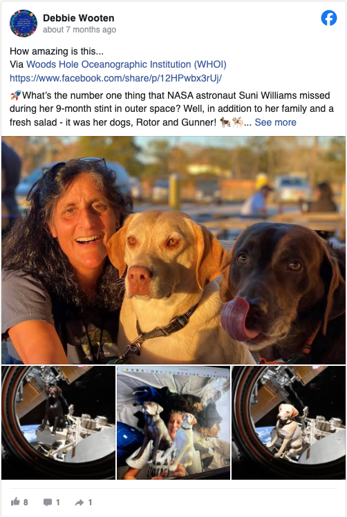 “What’s the number one thing that NASA astronaut Suni Williams missed during her 9-month stint in outer space?” WHOI later wrote. “Well, in addition to her family and fresh salad — it was her dogs, Rotor and Gunner!”