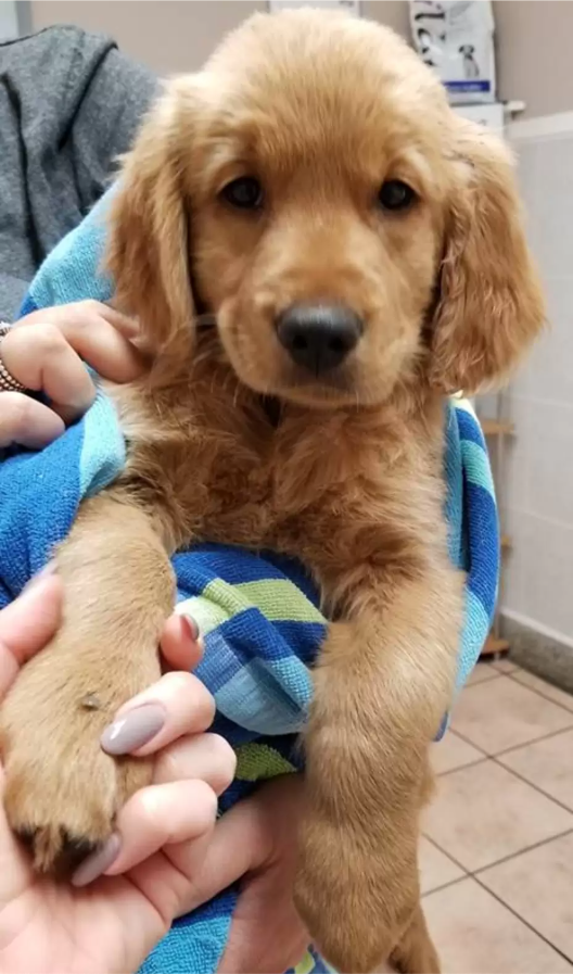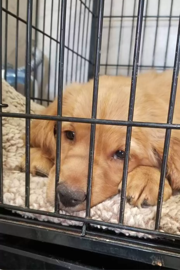 The Reyeses quickly tore open the box and discovered a golden retriever puppy — weak, frightened, and struggling to breathe.