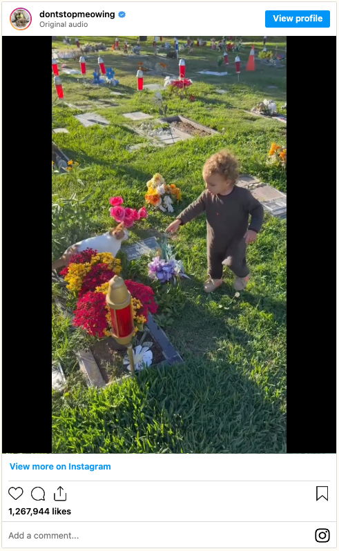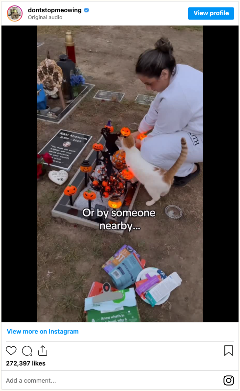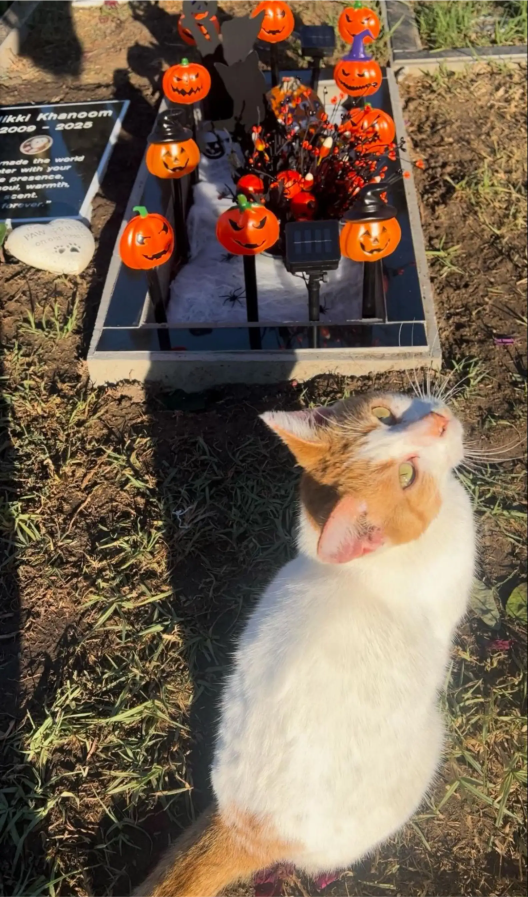 The couple and their toddler son had traveled to a pet cemetery in Los Angeles to visit Skye’s resting place. Their cherished cat had passed away in August, and with Halloween approaching, they wanted to decorate the grave for the holiday — the first one they would spend without her.