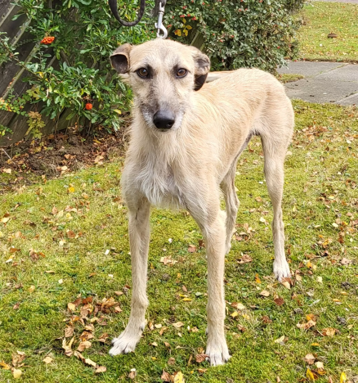 Tucked among thick ivy was a tan-colored lurcher, curled into himself, weak, frightened and clearly struggling.
