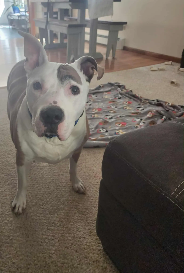 Nicole and her boyfriend were out of town and asked a friend to stay at their house to keep Bruiser company. Normally, Bruiser goes out back to use the bathroom — but this time, the backyard was a construction zone, with deep holes dug for the posts of a new deck.