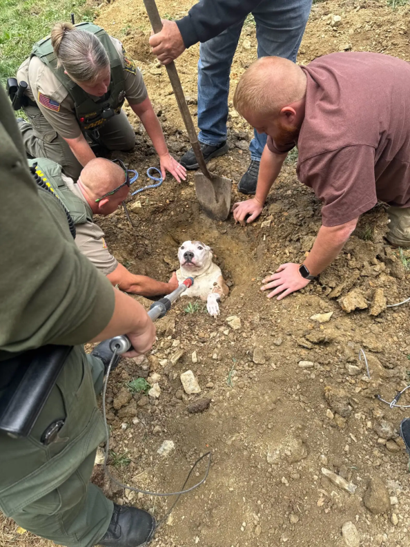 The rescue wasn’t quick. They had to carefully widen the hole and figure out how to lift a 100-pound senior dog without hurting him.