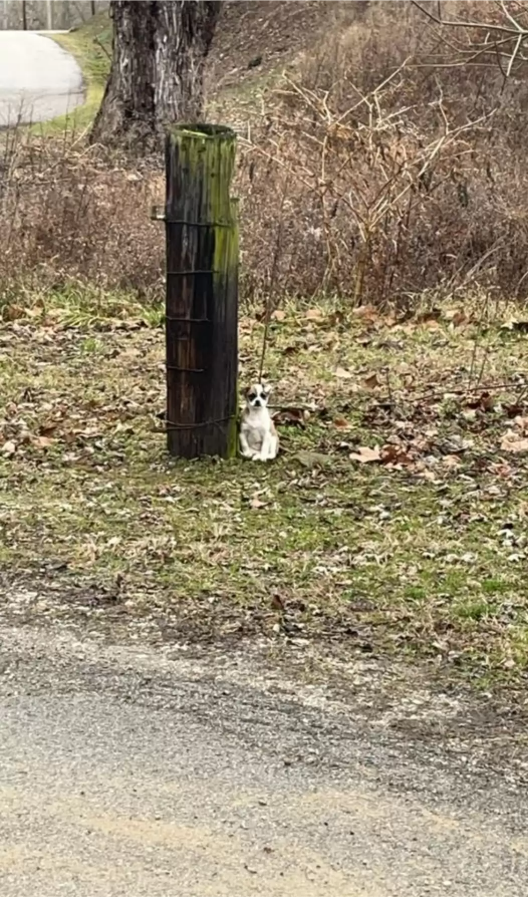As a driver sped down a quiet Kentucky road, a small shape by the shoulder caught their eye. Slowing down for a closer look, they realized it wasn’t just debris — it was a tiny brown-and-white puppy, tied to a broken tree, sitting silently and waiting to be seen.