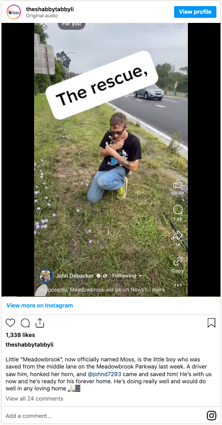 He brought Meadowbrook to The Shabby Tabby Cat Café, a cozy cat café and rescue that helps cats find loving homes. There, the once-terrified highway kitten now lounges peacefully, meeting new friends and waiting for a forever family to fall in love with him.