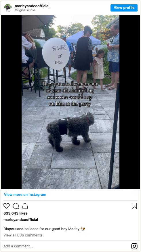 Now a little slower, but still as joyful and loving as ever, Marley continues to bring smiles wherever he goes — especially when there’s a party balloon bobbing gently above his head.