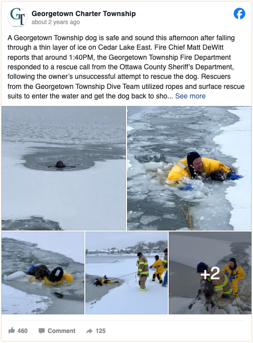“The dog was extremely fatigued and had ice forming on her face,” Georgetown Township Fire Department Chief Matt DeWitt shared in a Facebook post.