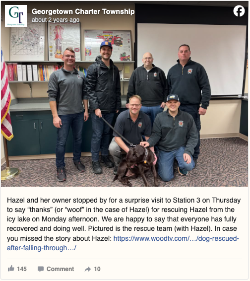 “Hazel stopped by for a surprise visit to thank the crew,” Georgetown Charter Township wrote. “We’re happy to report that everyone has fully recovered and is doing great.”