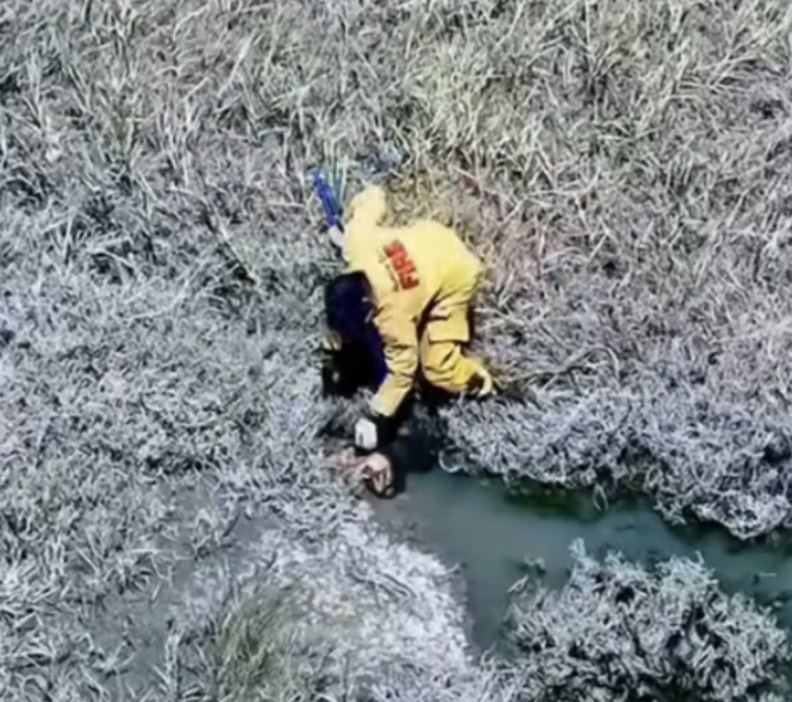 Fire captain Chris Clow responded with a rescue team and launched a drone to scan the area from above. Within moments, the drone’s camera revealed a frightened brown dog paddling through the canal, clearly exhausted and running out of strength.