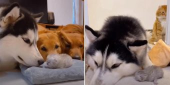 One adorable video became trending online showing three large dogs gathering together to welcome the new addition to the family – a litter of kittens. You can see in the … Continue reading Golden Retrievers and Husky Welcomes the New Kittens to the Family