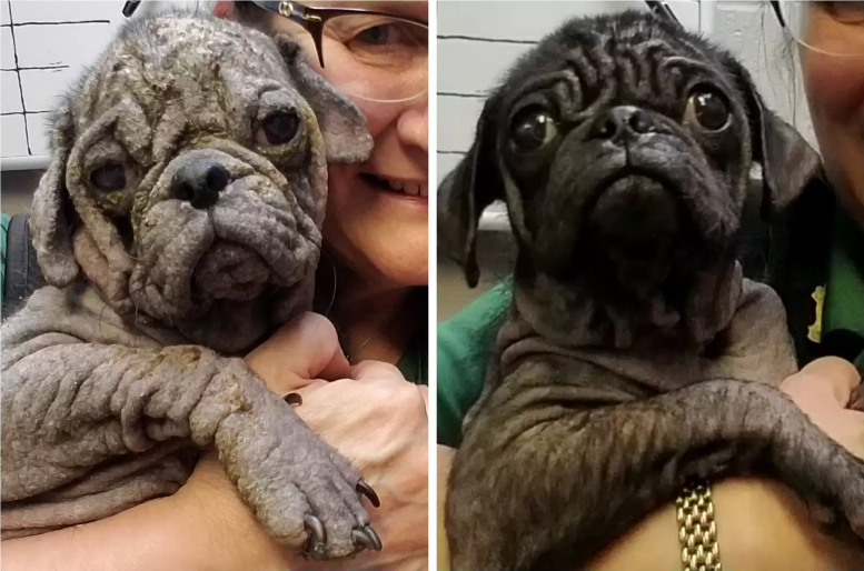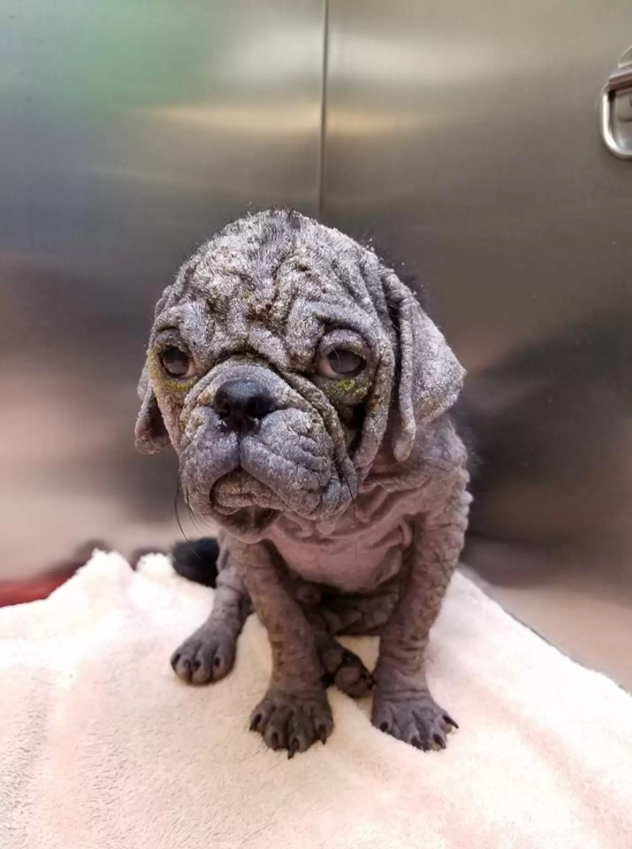 “His demodectic mange and skin infections were so advanced, it looked like he’d been suffering for at least six months — half his life,” said Signe Corbin, founder and director of Pug Rescue Austin.