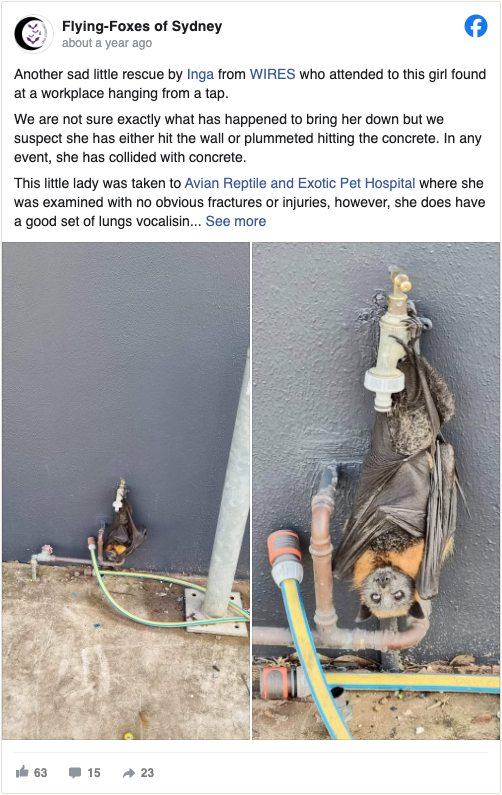 “She’s doing well,” a Sydney Wildlife Rescue representative told The Dodo. “She still has a bit of a sore head, but she’s eating well and has the company of two other grey-headed flying foxes who are also recovering.”