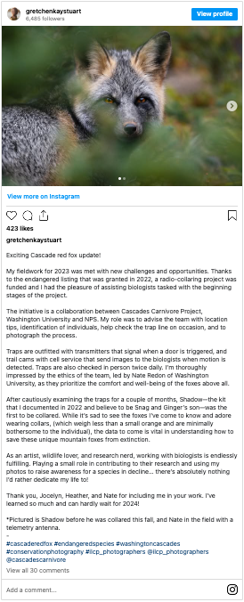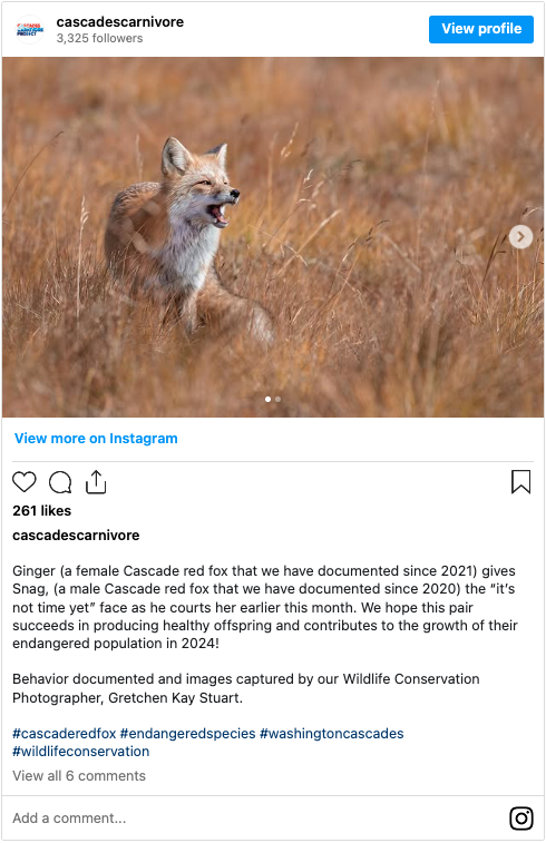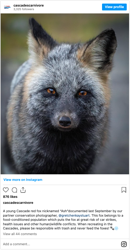 Burke later learned about the Cascades Carnivore Project, a nonprofit devoted to studying and protecting Cascade red foxes. The group urges hikers to respect the animals’ secrecy — never approach, feed, or disclose exact sighting locations.