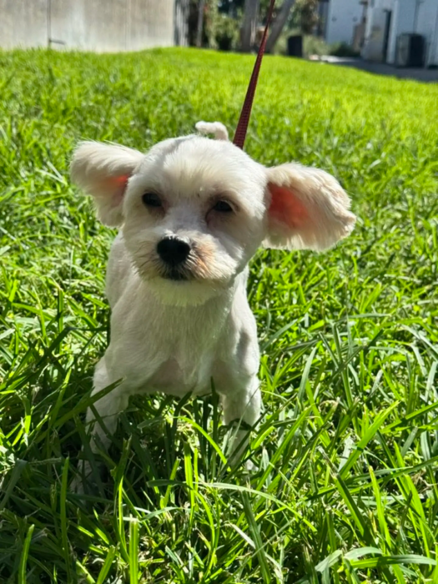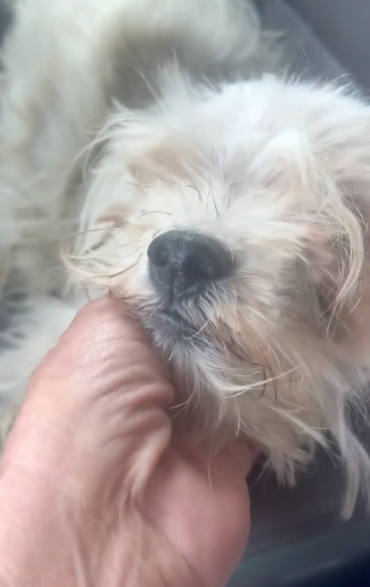 There, in the middle of the wreckage, was a small white dog. Her fur was so matted and tangled that she could barely move. Her body was hidden beneath layers of painful dreadlocks, her eyes almost completely sealed shut.