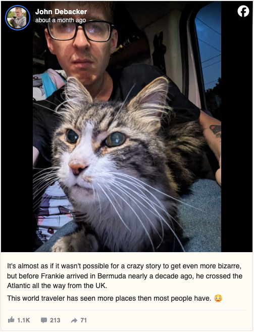 Curious to know more, Debacker reached out to the Bermuda SPCA, who helped identify the cat as Frankie — a friendly senior feline who had once lived a long way from where he was found.