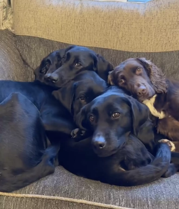 The cuddle puddle isn’t exclusive to the Labs, either. Carr’s cocker spaniels have recently started joining in, creating even more confusion — and even cuter chaos.