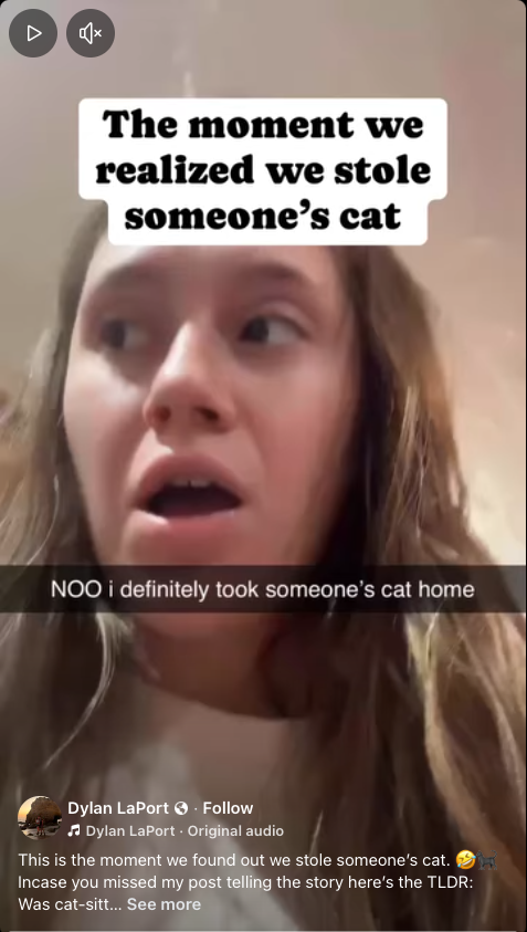 LaPort posted the video to Facebook with the caption, “The moment we found out we stole someone’s cat.” It quickly made the rounds online — until it reached Kelly Aleschus, the very neighbor who’d helped catch the cat.