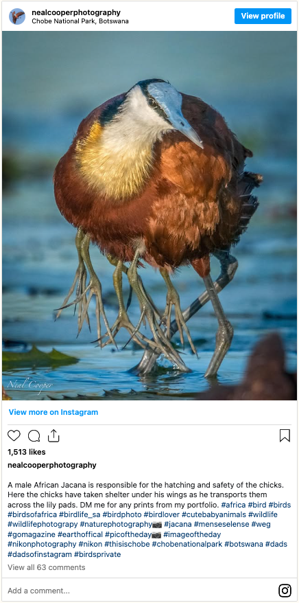 When photographer Neal Cooper aimed his camera at a male African jacana darting across a pond in Botswana’s Chobe National Park, he thought he’d simply captured a striking wildlife moment.