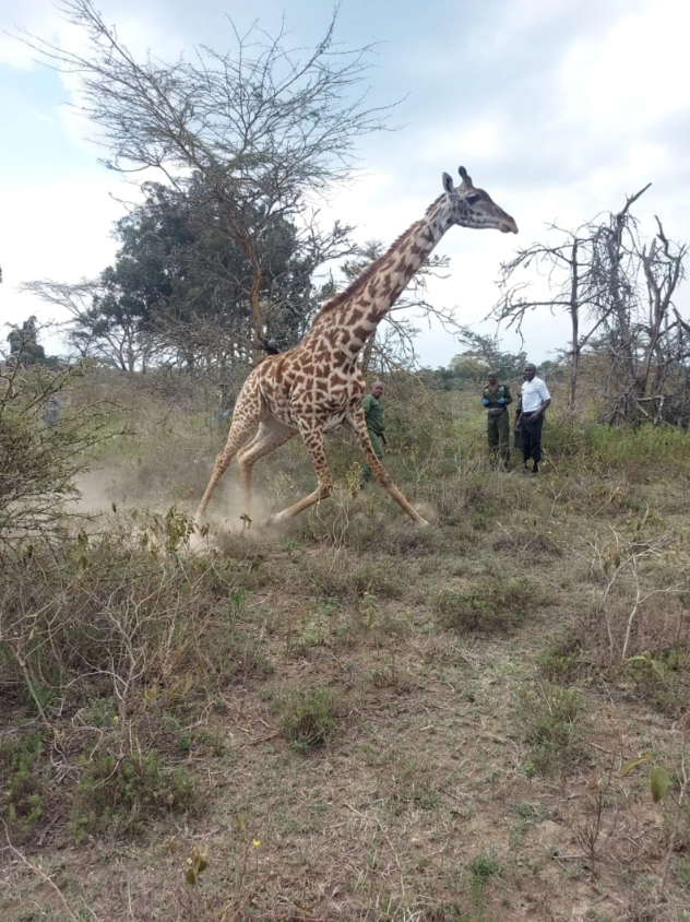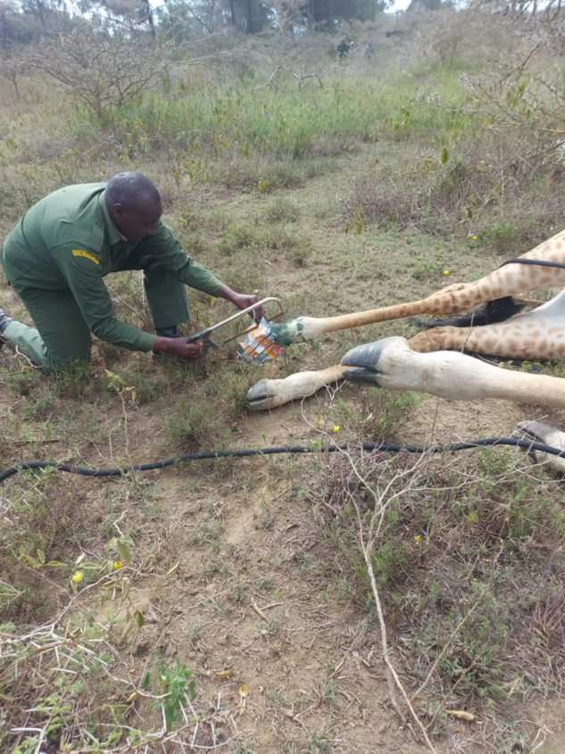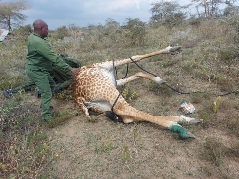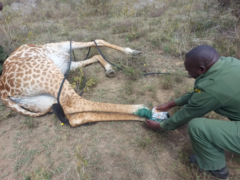 Working alongside the Kenya Wildlife Service (KWS), rescuers carefully guided the giraffe away from her herd so they could help her safely.