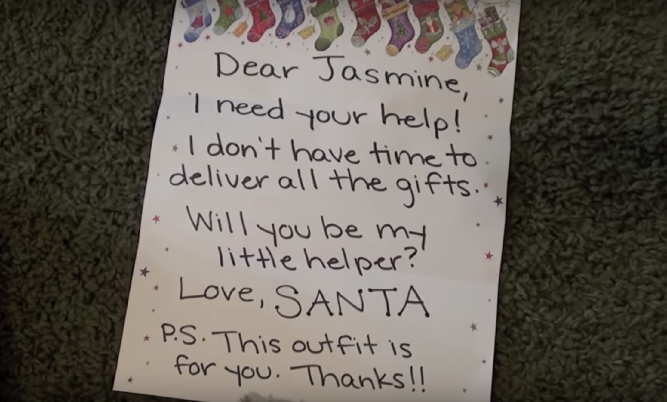 “Dear Jasmine. I need your help! I don’t have time to deliver all the gifts. Will you be my little helper? Love, Santa. P.S., This outfit is for you. Thanks!”