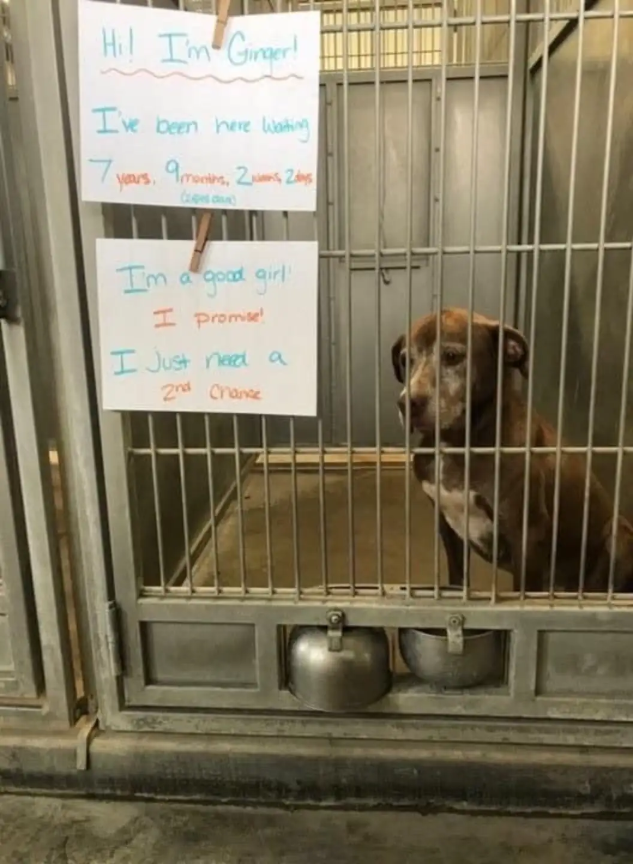 Days turned into months. Months into years. From her kennel, Ginger would quietly watch families walk past her enclosure, smiling at other dogs — younger, friendlier, easier — while she was left behind again and again.