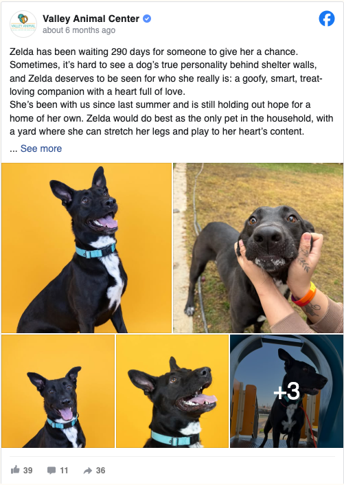 “Zelda has been waiting far too long for a family to call her own,” Valley Animal Center wrote on Facebook.