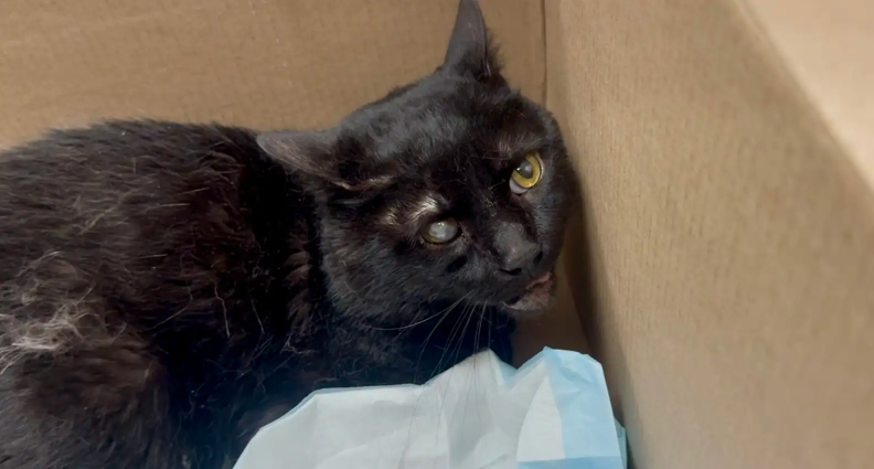 The manager quickly brought the box inside, tearing through layers of tape to open it — and there, staring up weakly from the darkness, was a senior black cat. He was alive, but barely.