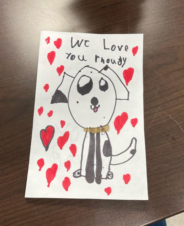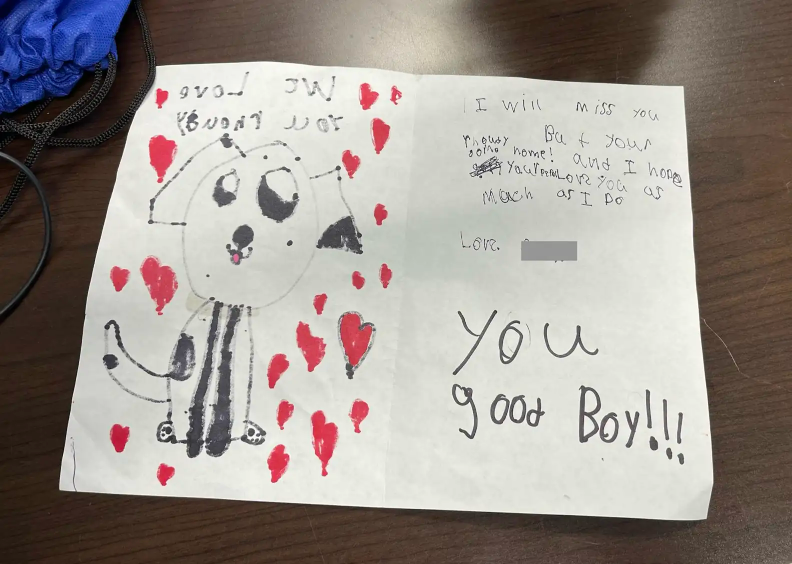 Rhoudy didn’t come alone. Tucked in with him was a handwritten note — clearly written by children who loved him deeply.
