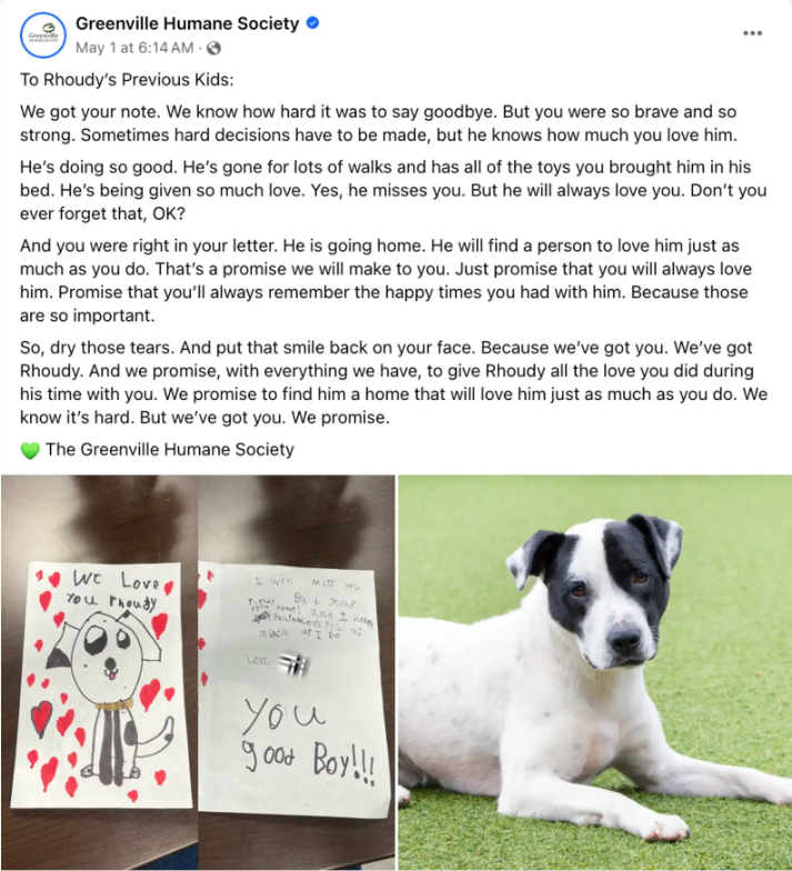 The shelter’s message goes on to reassure the kids that Rhoudy is safe, cared for and cherished — and ends with a promise that they will do everything possible to find him a wonderful new home.