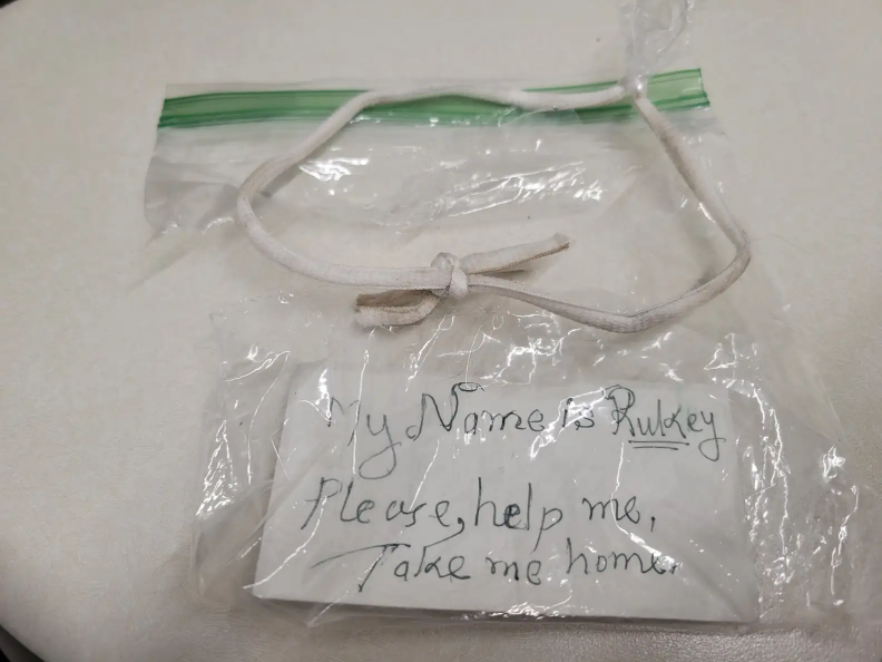 That’s when they saw it: a small plastic bag tied to her collar with a piece of rope. Inside was a handwritten note that read simply: