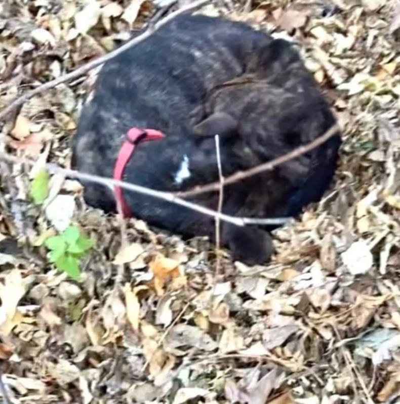 Far from any nearby homes, in a rural patch of land, they noticed what looked like a small pile of brown-and-black fur barely visible beneath the autumn foliage.