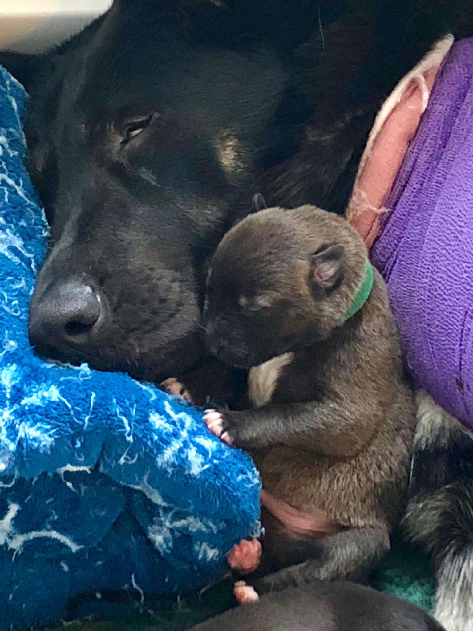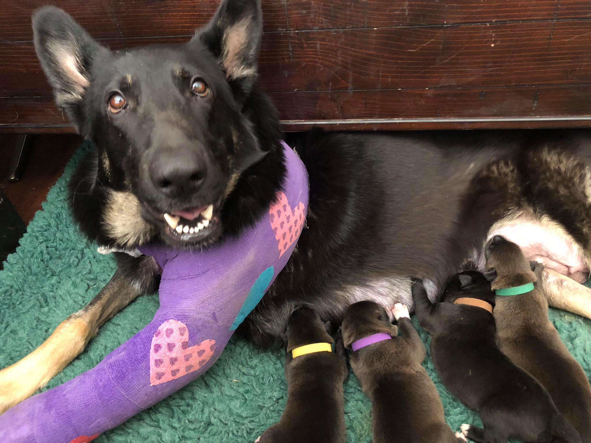 The mother-to-be was taken into a foster home. Even though she was in a cast and recovering from her injuries, Marley successfully gave birth to a litter of happy, healthy puppies.