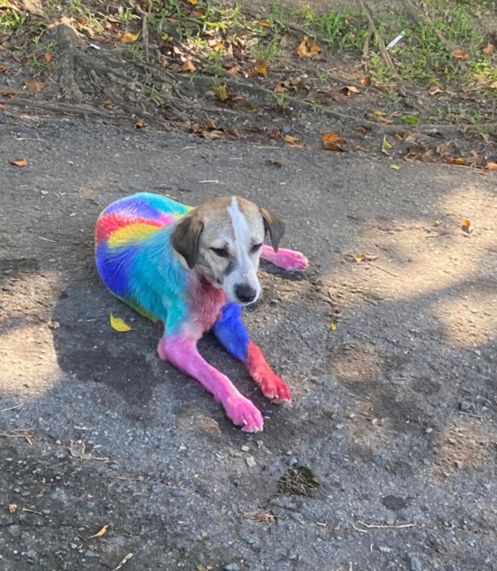 Chantal reappeared trembling — her white-and-brown fur completely coated in bright, multicolored paint. One look at her terrified expression made it clear this wasn’t an accident.