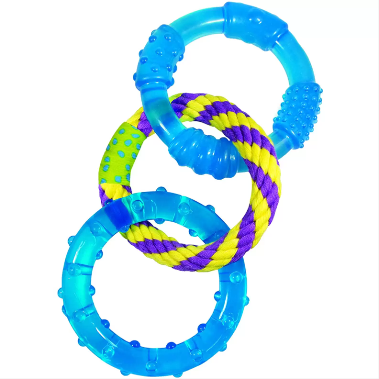 These textured links massage sore gums, making them ideal for teething puppies. They’re great for solo chewing, tug-of-war and even water play since they float.