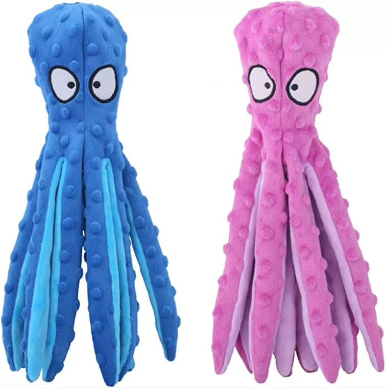 Equal parts squeaky, crinkly and crunchy, this stuffing-free octopus is a sensory dream for playful puppies. With eight tug-friendly legs, it’s perfect for solo play or group tug sessions.
