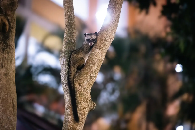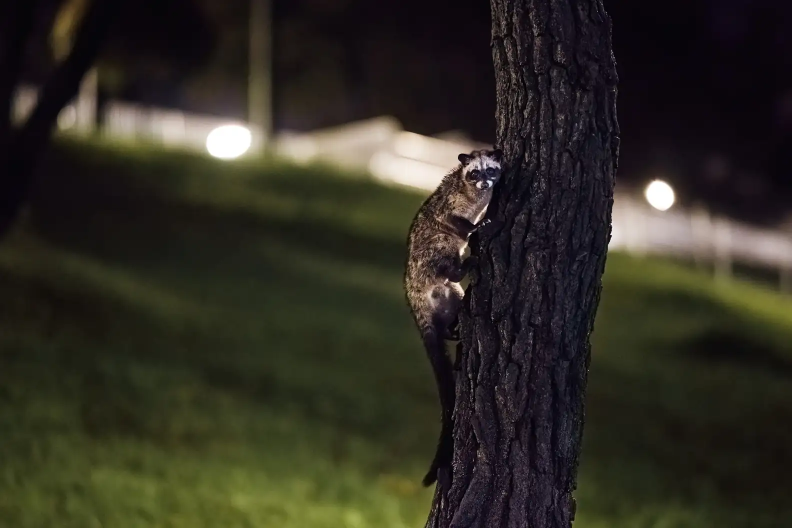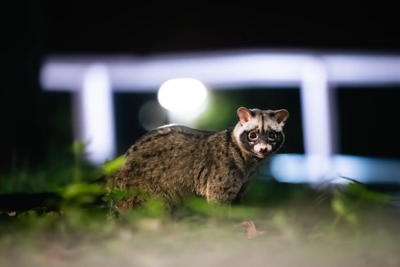 Under the soft glow of porch lights, the civet glances toward him — a fleeting, magical moment — before disappearing into the darkness again.