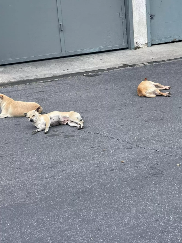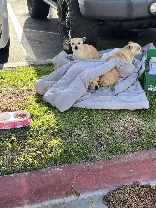 When Hall arrived, she spotted only the blanket at first. Then, to her surprise, the dogs stirred — all three had been huddled tightly underneath it, trying to keep warm.