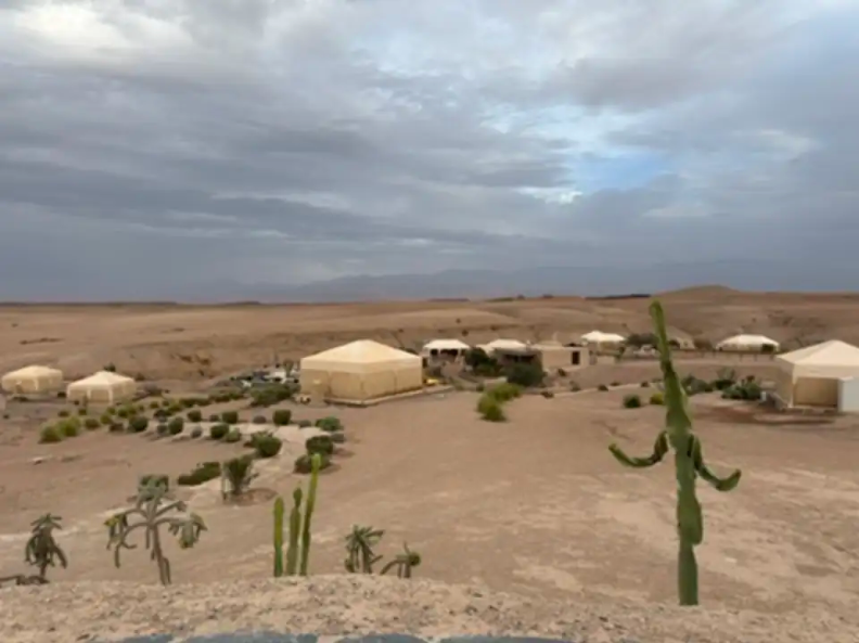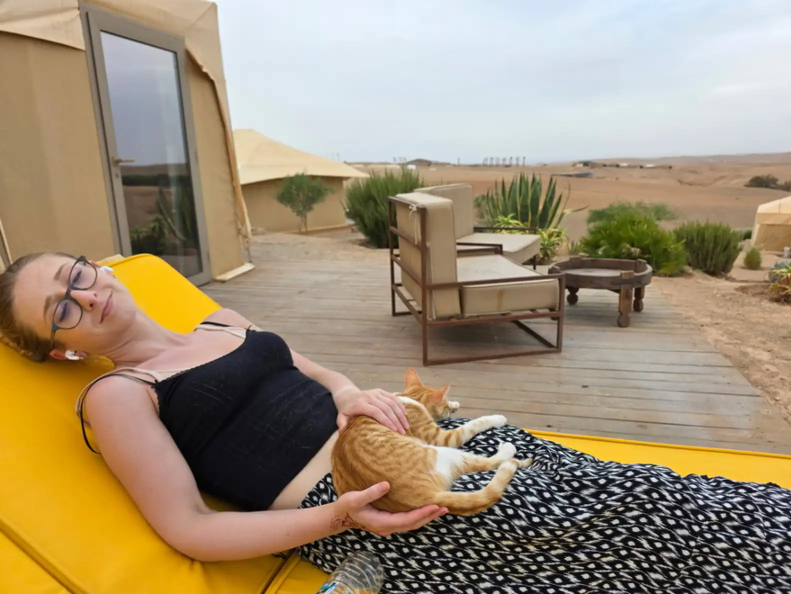 The couple had been camping in the rugged beauty of the Agafay Desert when they noticed a small figure lingering outside their tent.