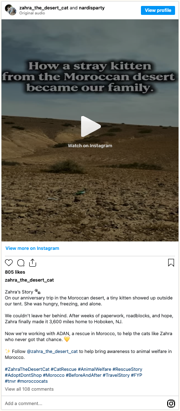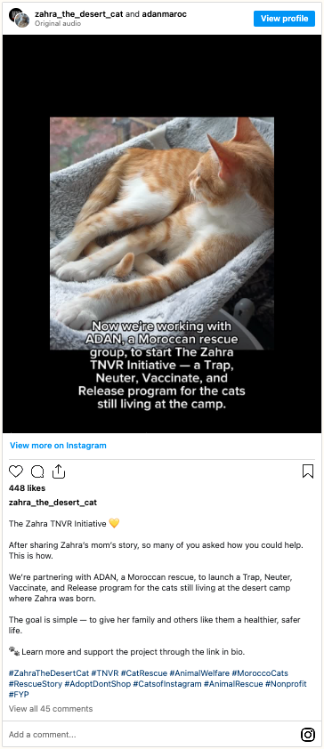 To help stray cats in Morocco like Zahra, you can learn more about her TNVR initiative here. Keep up with Zahra’s adventures on Instagram and TikTok.