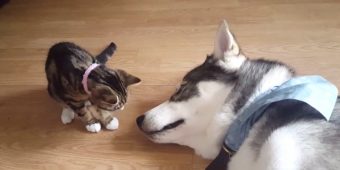 Kuma the Alaskan Husky was an only pet living with his mom, Sara. And Mom always felt bad when she had to go and leave the dog behind all alone … Continue reading The New Kitten Goes In For A Kiss On The Sleeping Husky