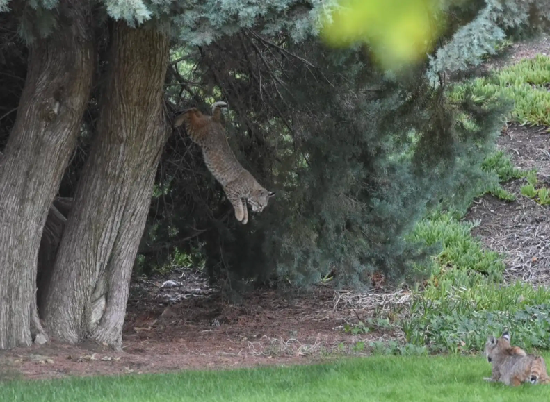 When David Schneider and his wife pulled into their driveway in Santa Clarita, California, David noticed something furry lingering at the edge of their yard. One glance at the animal’s spotted coat, tufted ears and striped legs made it clear — it was a bobcat.