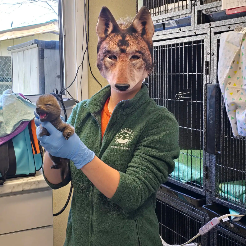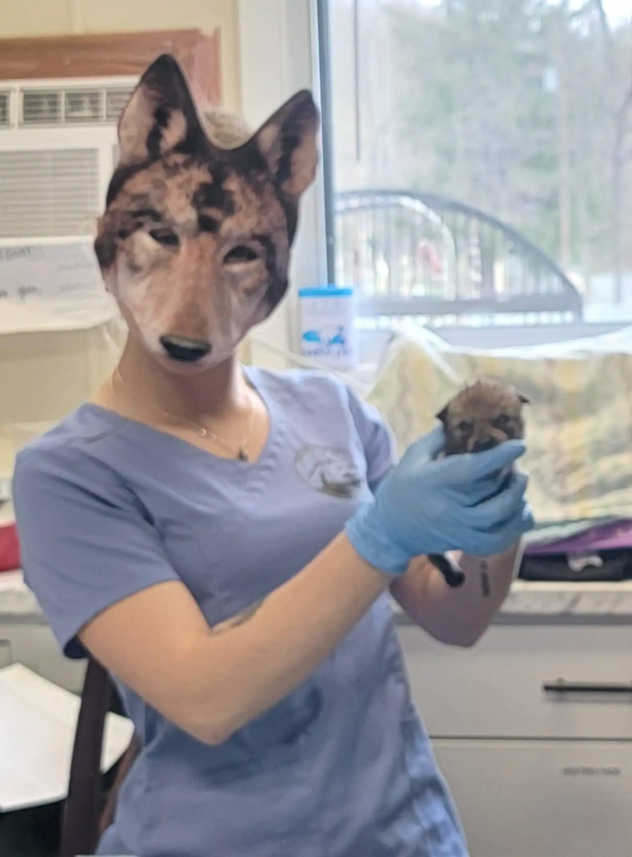 “We wear masks so the pups don’t associate people with food or comfort,” rehabber Amanda told The Dodo. “Coyotes and eagles imprint very easily, so once their eyes opened, we started using the masks to help them stay wild.”