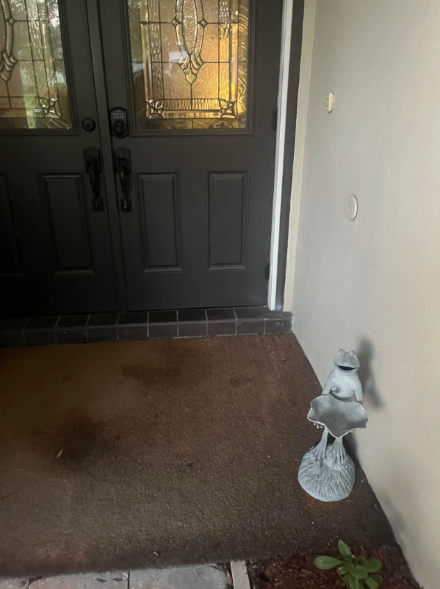 At first glance, everything looked perfectly normal. Her porch was quiet, her plants were in place, and her favorite frog statue by the door was sitting exactly where it always did.