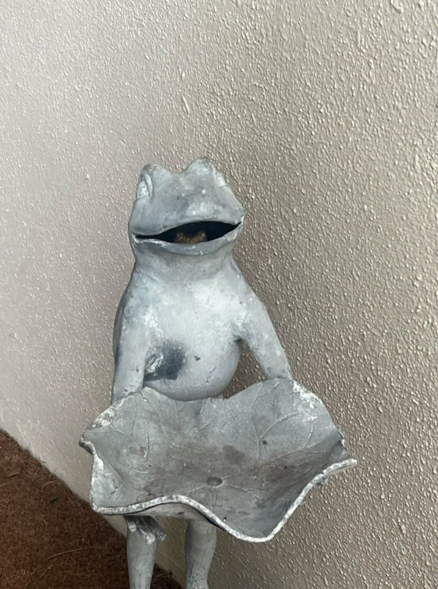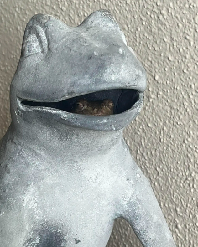 The frog, meanwhile, seemed perfectly content in his new home, calmly peeking out from behind the statue’s grin like he owned the place.