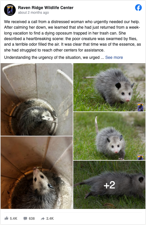 To help animals like this opossum get the care they need, you can donate to Raven Ridge Wildlife Center here.