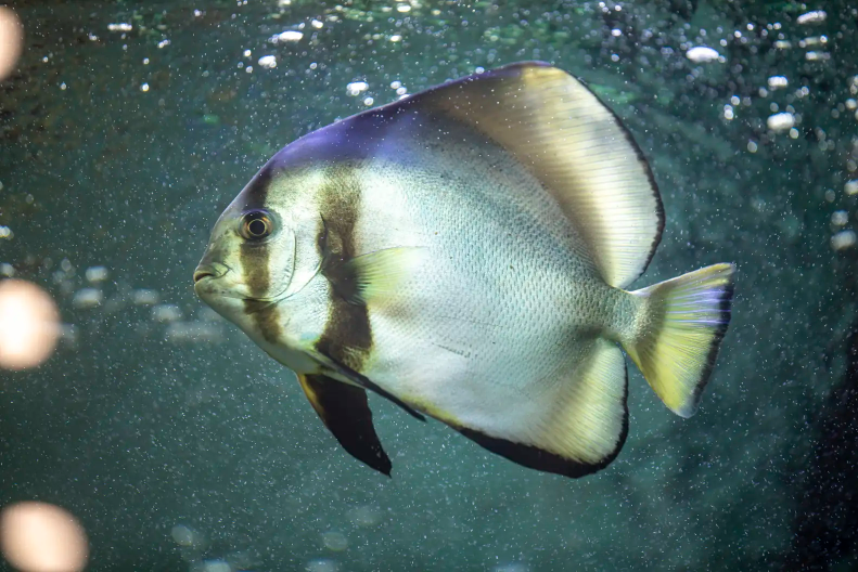 Adult batfish are sleek and silver with dark vertical stripes, but when they’re young, they transform into perfect leaf mimics. Their coloring, shape, and even motion are designed to fool predators into thinking they’re just debris floating by.